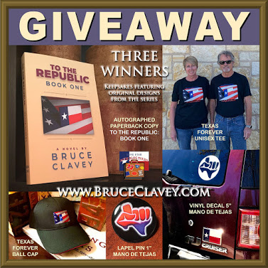 THREE WINNERS each receive a prize pack including: Autographed paperback copy of To the Republic; unisex tee with the “Texas Forever” design; baseball cap stitched with the “Texas Forever” design; ceramic lapel pin with the “Mano de Tejas” design; vinyl 5” decal with the “Mano deTejas” design.